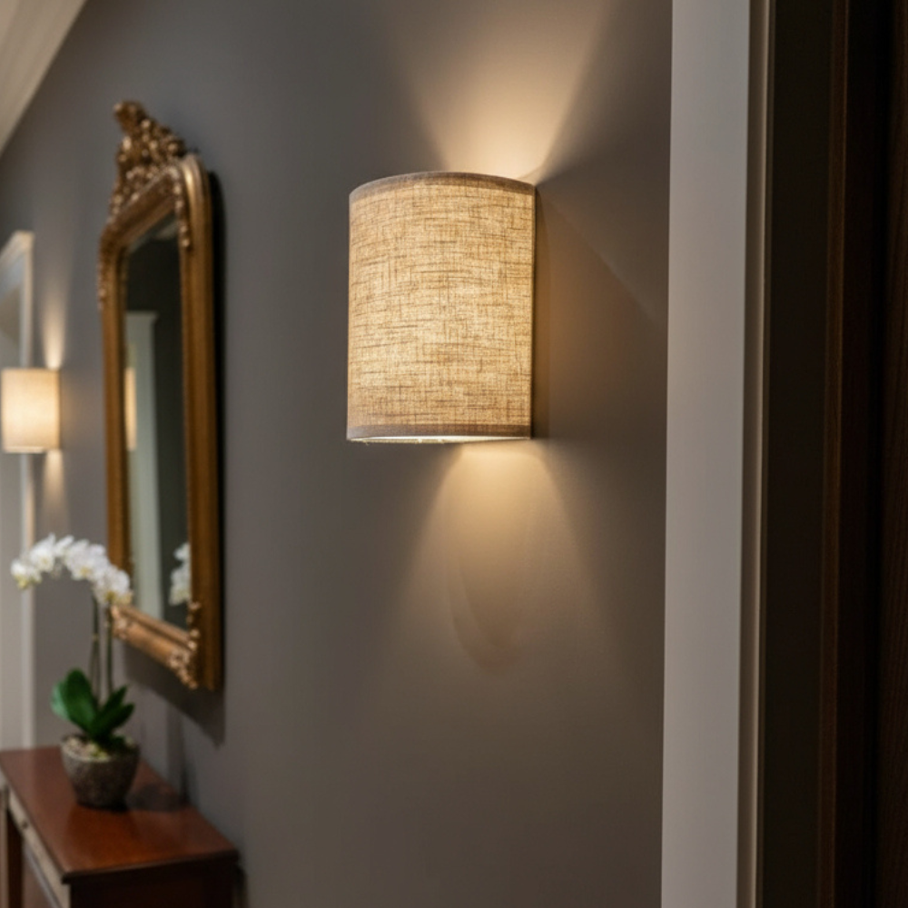 Denne væglampe er udformet med sans for detaljer og gør blød belysning til en kunstform. Den vævede stofskærm udsender en varm, omgivende glød, der giver dybde og ro til ethvert miljø. Uanset om den placeres i entréen eller ved siden af spejle, giver den raffineret tekstur og afbalanceret lys til dit hjem.