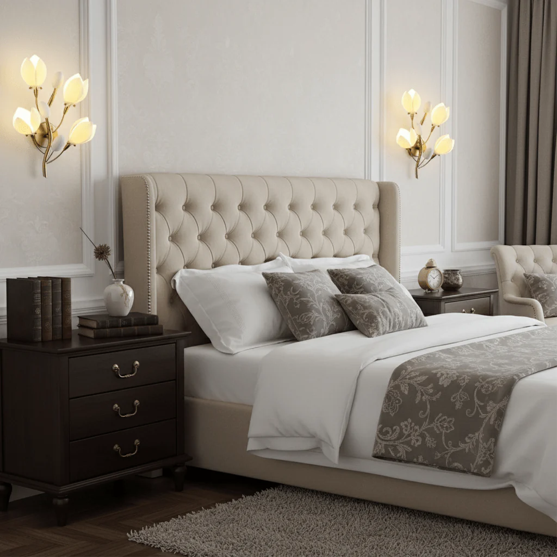 Denne væglampe er inspireret af de blomstrende blomsters naturlige ynde og forvandler ethvert rum til en fredfyldt, lysende have. Hver kronbladsformede skærm er fint udformet af keramik og udsender en blød, varm glød, der fremkalder ro og skønhed. Den forgrenede struktur, der er udført i børstet guld, afspejler naturens blide bevægelser - elegant, skulpturelt og tidløst.