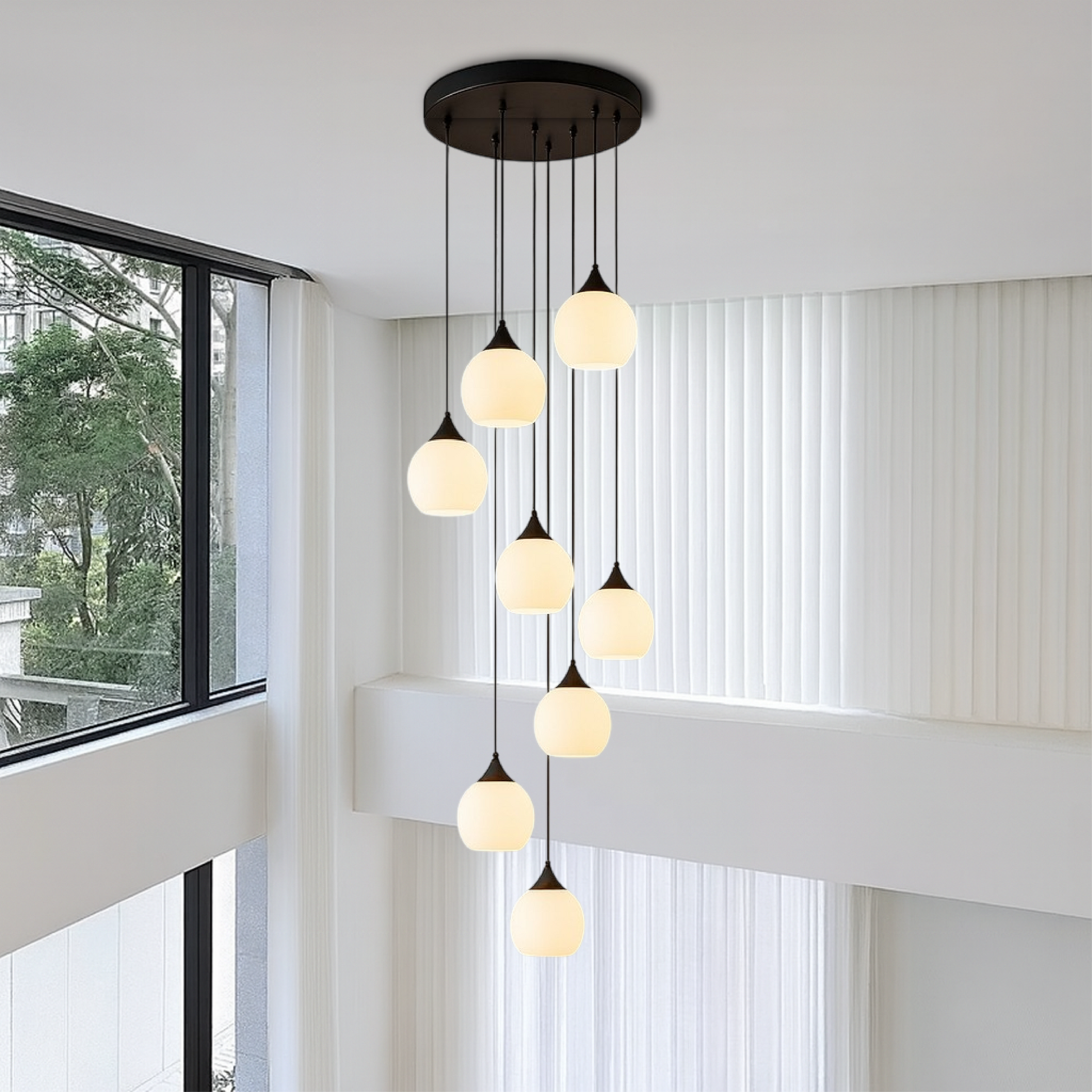 Denne pendel er mere end bare et belysningselement - den er en erklæring om stil og rumlig harmoni. Den er designet til store rum som f.eks. dobbelthøje stuer eller foyerer, og dens elegant forskudte pærer trækker øjet opad og forstærker både volumen og stemning. Det er en perfekt blanding af form og funktion til dem, der sætter pris på både raffinement og komfort.