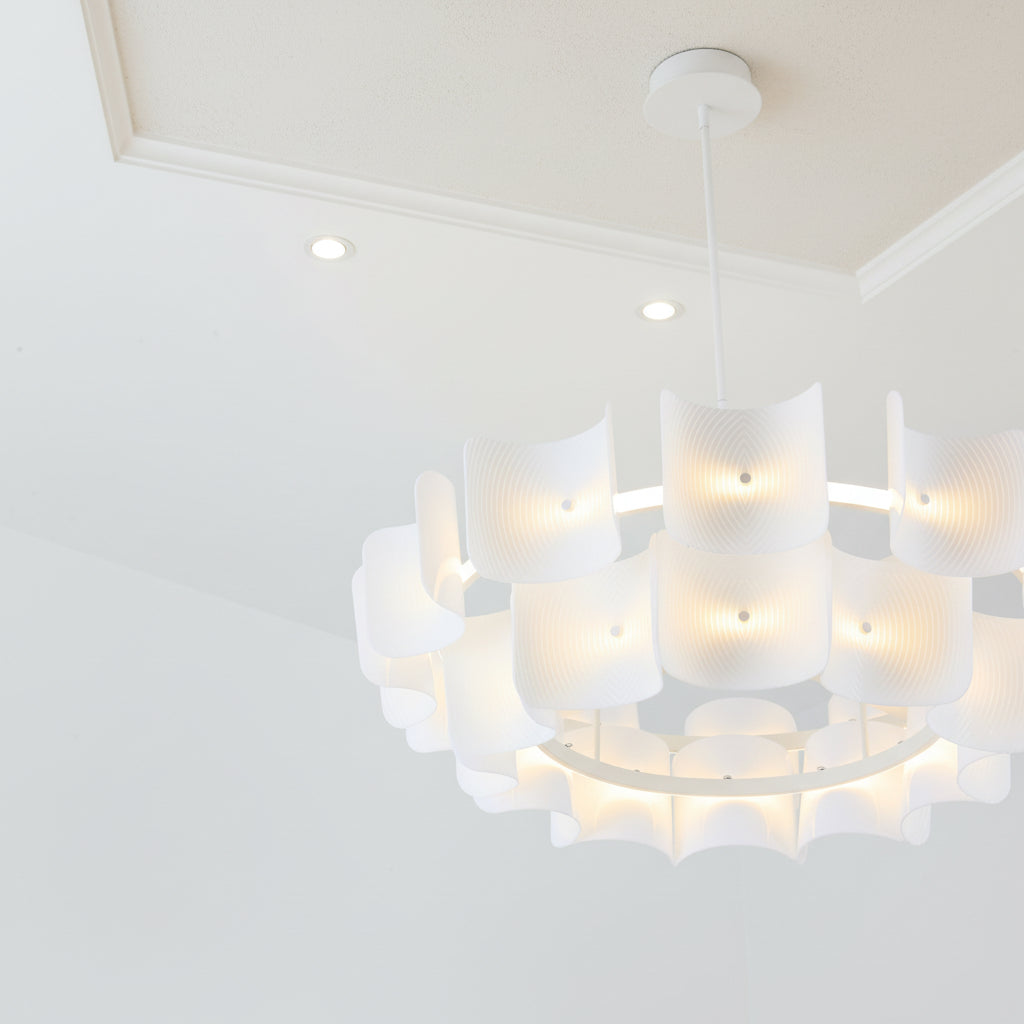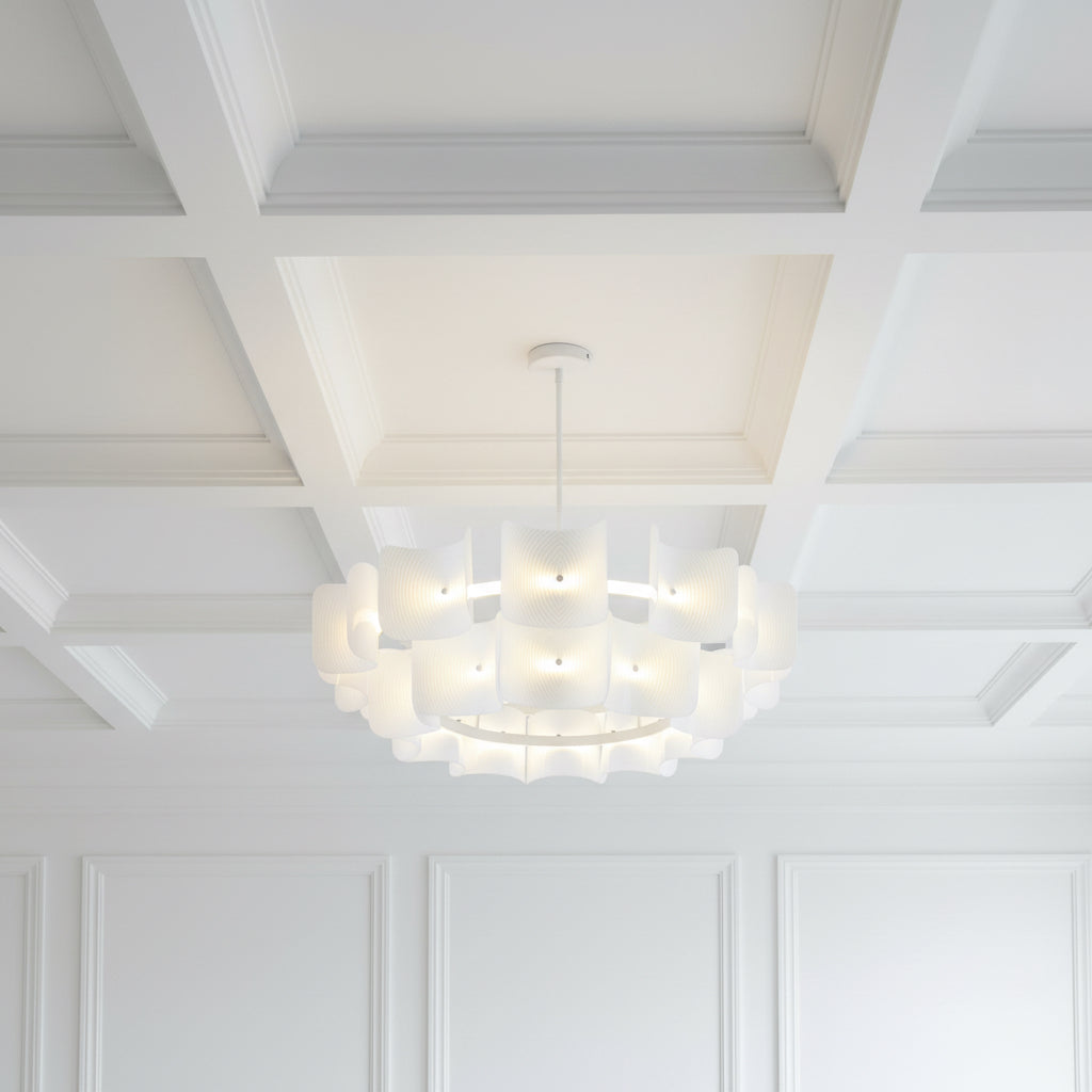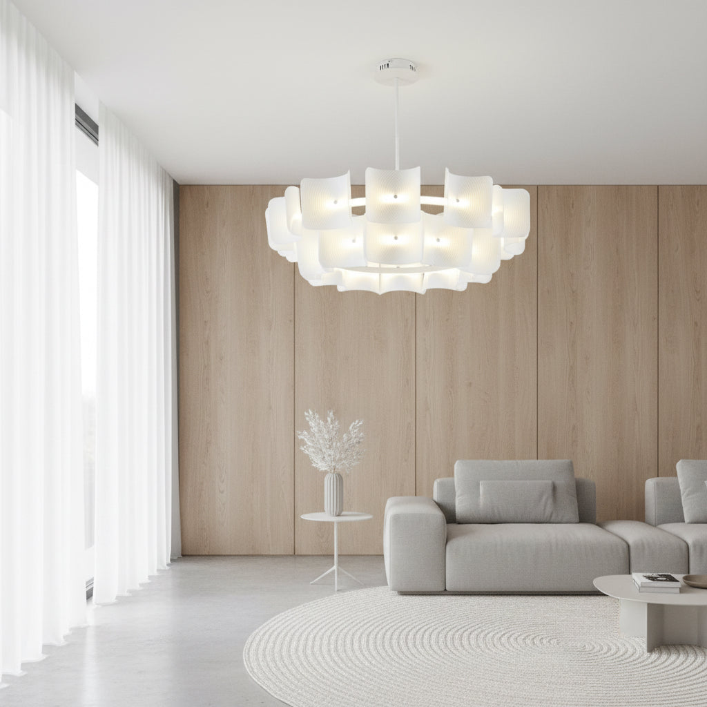 Denne lysekrone indfanger essensen af raffineret kunst med sine skulpturelle glaspaneler, hvor hvert stykke reflekterer lyset i et blødt, yndefuldt mønster. Det lagdelte design skaber en rolig og sofistikeret atmosfære, der er perfekt til at løfte spisestuer, opholdsrum eller indgangspartier. Den er bygget med præcision og i førsteklasses materialer og udstråler både elegance og varig kvalitet, hvilket gør den til et statement-møbel, der aldrig mister sin charme.