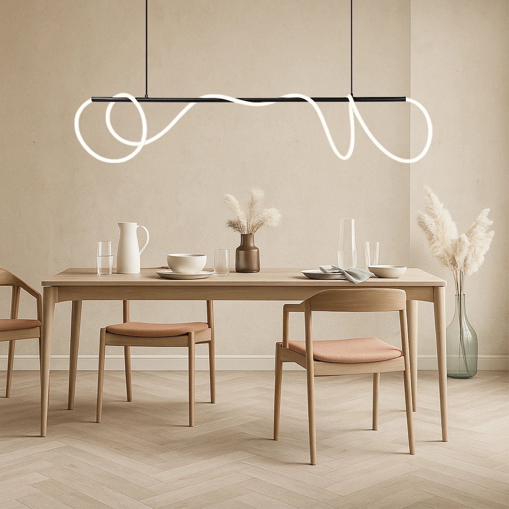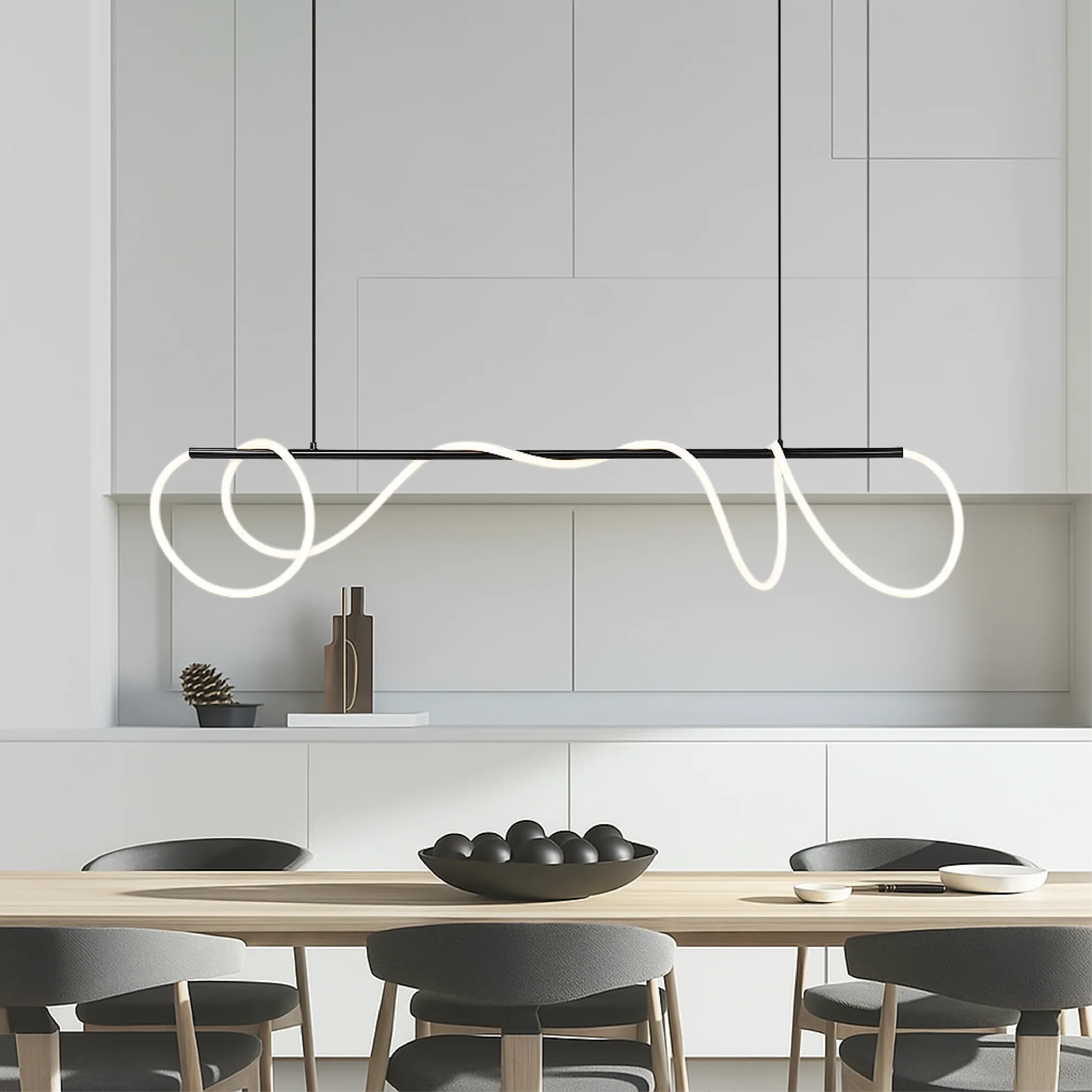 Linear Kitchen Table Pendant Light er designet til at afgive en varm, behagelig glød, der fylder rummet uden at være hård ved øjnene. Uanset om du nyder middagen ved køkkenbordet eller slapper af i soveværelset, skaber denne lampe den perfekte atmosfære.