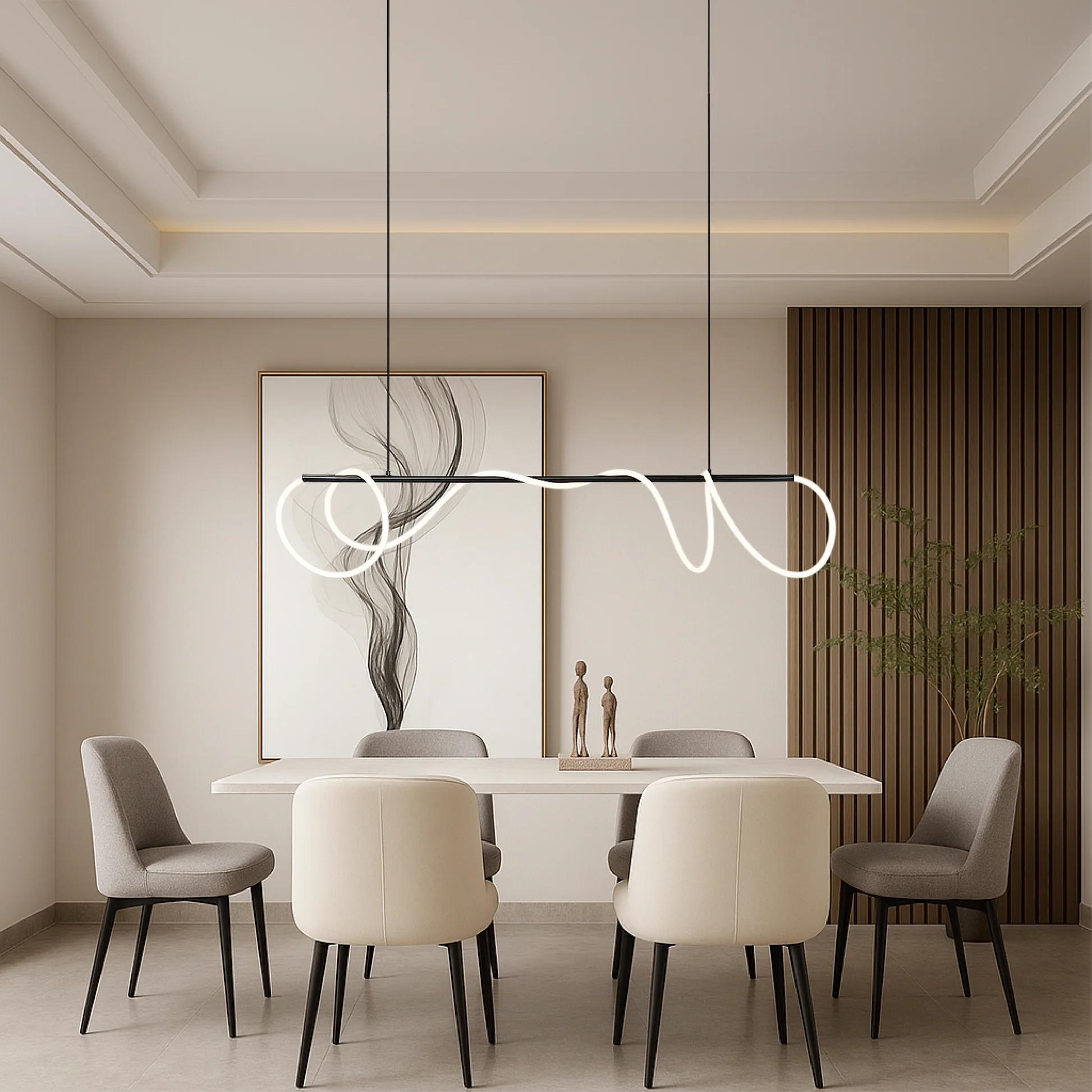 Nej, Linear Kitchen Table Pendant Light kan ikke dæmpes, men du kan nemt justere lysstyrken med den medfølgende fjernbetjening, så den passer til forskellige stemninger og lejligheder. Den har en varm hvid farvetemperatur (3000K), der giver et blødt og indbydende lys, der fremhæver køkkener, spiseborde og moderne opholdsrum. Den justerbare belysning giver både funktionel belysning og behagelig stemning, hvilket gør den ideel til både daglig brug og afslappede sammenkomster.
