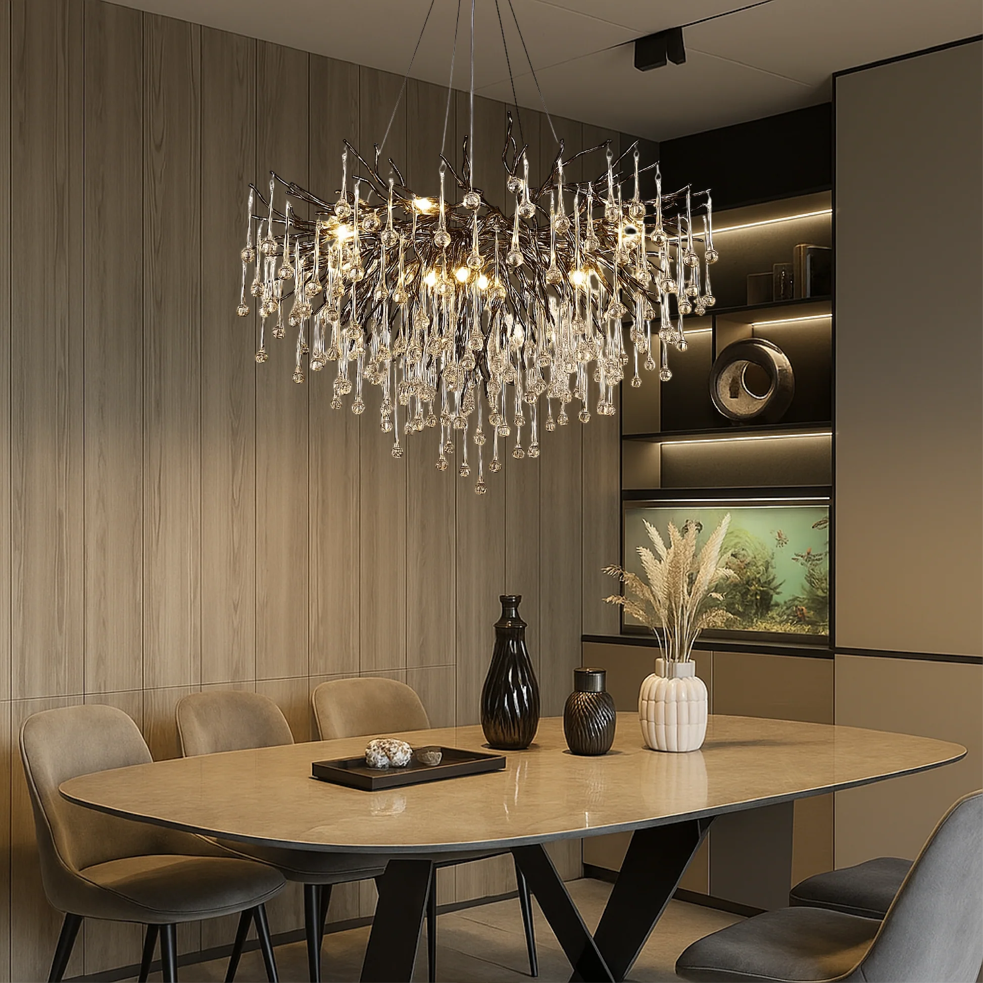 Nej, Raindrop Black Chandelier kan ikke dæmpes. Denhar et fast lysdesign, der giver en ensartet, varm belysning.Lampen udsender en varm farvetemperatur på 3000 K, hvilket skaber en hyggelig og indbydende atmosfære, der er ideel til både stuer og spisestuer. Den er designet til brug med en standard on/off-vægafbryder.